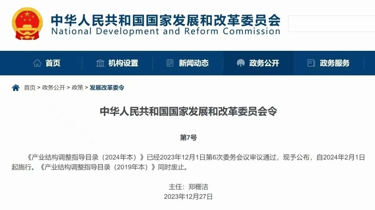 國家發(fā)展改革委12月29日對外發(fā)布《產(chǎn)業(yè)結構調整指導目錄(2024年本)》,自2024年2月1日起正式施行。國家發(fā)展改革委有關(guān)負責人介紹,目錄2024年本共有條目1005條,其中鼓勵類(lèi)352條、限制類(lèi)231條、淘汰類(lèi)422條。與上一版相比,鼓勵類(lèi)新增了“智能制造”“農業(yè)機械裝備”“數控機床”“網(wǎng)絡(luò )安全”等行業(yè)大類(lèi)及相關(guān)領(lǐng)域有利于產(chǎn)業(yè)優(yōu)化升級的條目,限制類(lèi)、淘汰類(lèi)中新增了“消防”“建筑”行業(yè)大類(lèi)及相關(guān)領(lǐng)域不符合綠色發(fā)展和安全生產(chǎn)要求的條目。根據目錄2024年本,鼓勵類(lèi)、限制類(lèi)、淘汰類(lèi)中涉及行業(yè)類(lèi)產(chǎn)品的條目分別如下:○ 風(fēng)力發(fā)電技術(shù)與應用:15MW 等級及以上海上風(fēng)電機組技術(shù)開(kāi)發(fā)與設備制造,漂浮式海上風(fēng)電技術(shù),高原、山區風(fēng)電場(chǎng)建設與設備生產(chǎn)制造,海上風(fēng)電場(chǎng)建設與設備及海底電纜制造,稀土永磁材料在風(fēng)力發(fā)電機中應用
